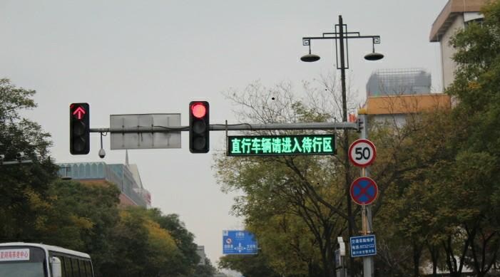 為了(le)提高路口(kǒu)通行能力(lì)。在路口設置的直行設施,當行駛(shǐ)至這類路口的車輛遇直行和左轉(zhuǎn)彎信號放行時,路口一側紅綠燈路燈杆上的引導電子屏會適時顯示“請直行車輛(liàng)進入待行區等候放行”的提示(shì),此時,直行車輛可以進入路口施劃的待行區等待綠燈放行後(hòu)即(jí)可(kě)通行(háng)。